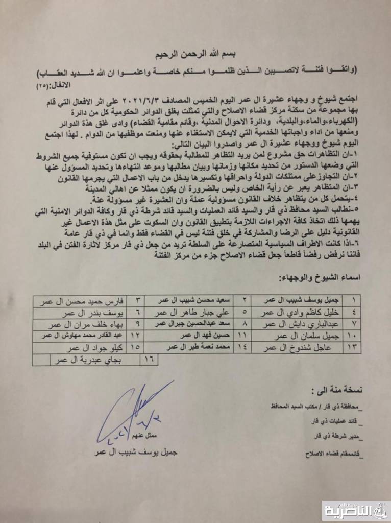 شبكة اخبار الناصرية: اجتمع عدد من شيوخ عشائر ال عمر في قضاء الاصلاح على اثر الاحداث الاخيرة التي شهدتها المدينة رافضين اغلاق المؤسسات الحكومية والخدمية. انتهى.