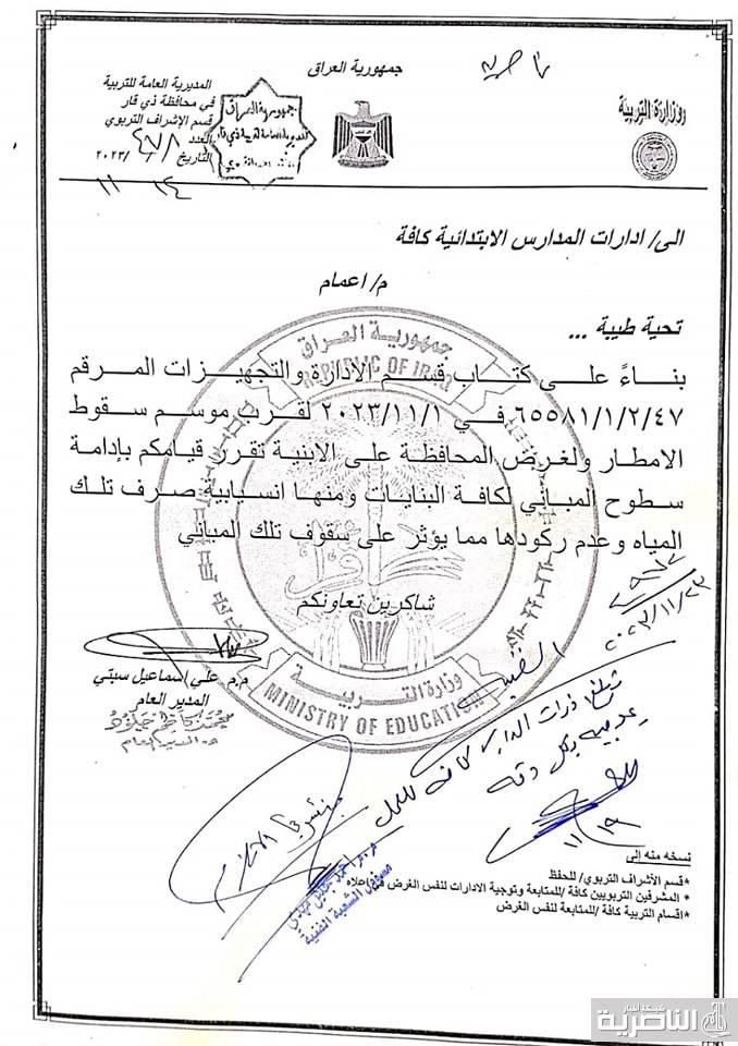 وذكرت وثيقة تابعتها شبكة اخبار الناصرية انه مع قرب موسم هطول الامطار وخوفاً من ركود المياه على اسطح المدارس لحماياتها من اي ضرر وجهت المديرية ادارات المدارس بادامة اسطح مدارسهم.